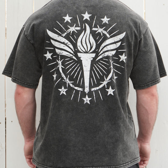The front features our Land of Liberty Hero Logo, while the back showcases the Liberty Torch — encircled by stars and barbed wire — a mark of grit, resilience, and freedom. More than apparel, this tee carries the spirit of Americana wherever you go.